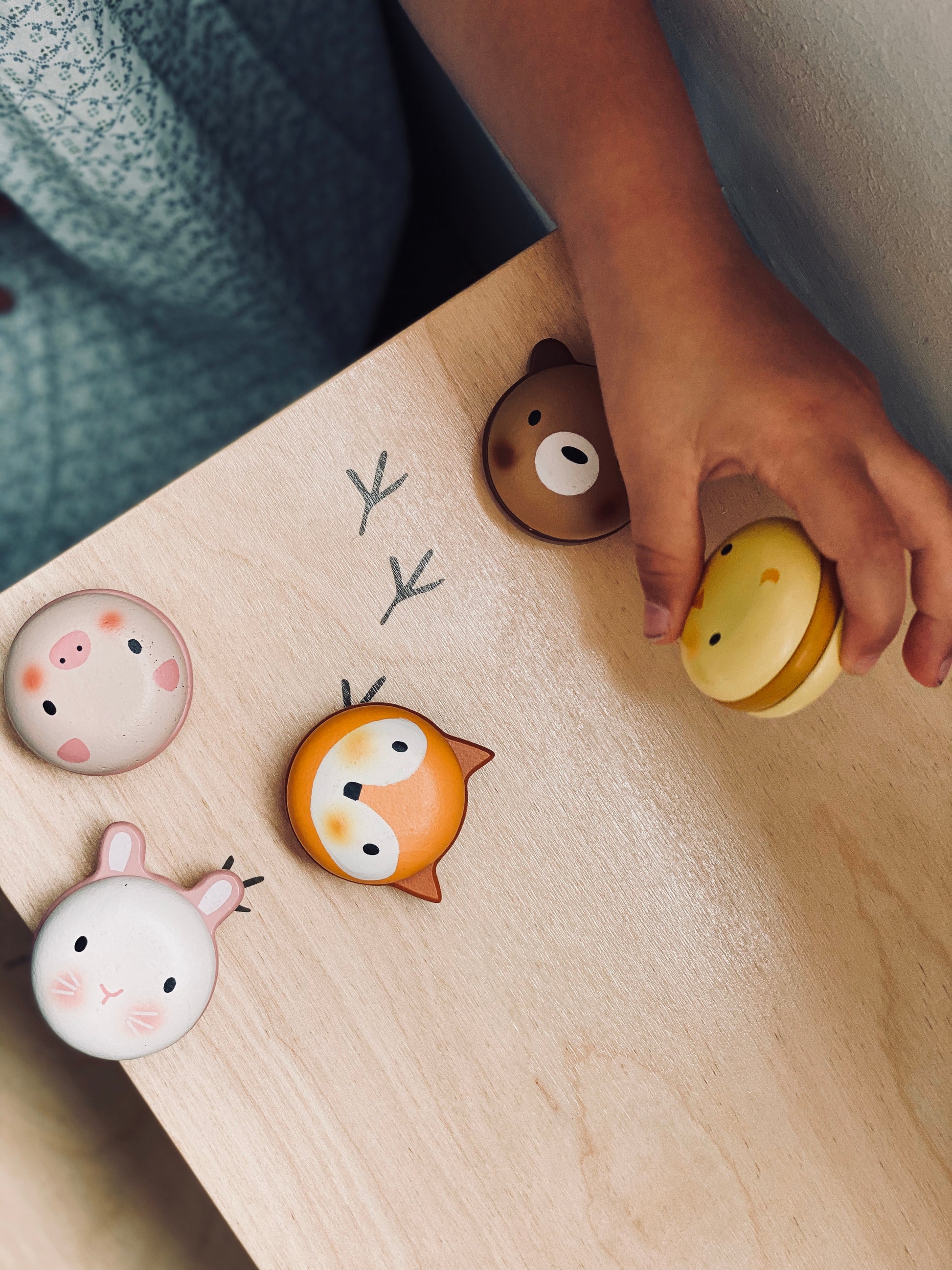 Five beautifully coloured wooden macarons shaped like a chick, bunny, bear, piglet, and fox — each with its own pastel filling, just like the real treat. Age 24m+